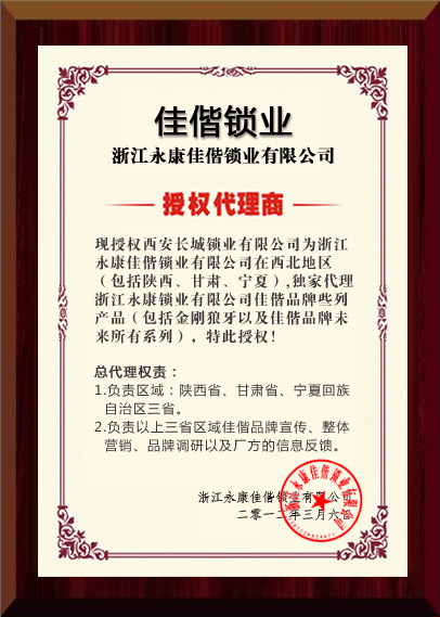 佳偕锁业-总代理授权书